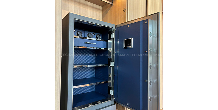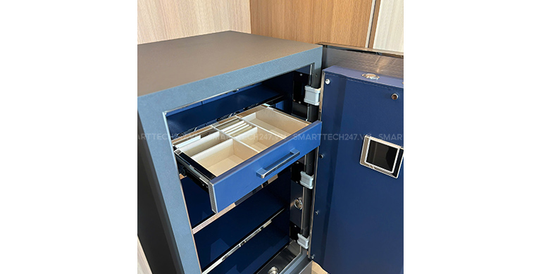 Hơn nữa nội thất của két còn được tích hợp thêm ngăn đựng trang sức vô cùng hiện đại, ngăn đựng trang sức được hãng bọ da nhung giúp bảo vệ những món đồ trang sức, nhẫn, vòng tay, vòng cổ,… của bạn không bị xước xát hoặc bị hư hại khi bảo quản.