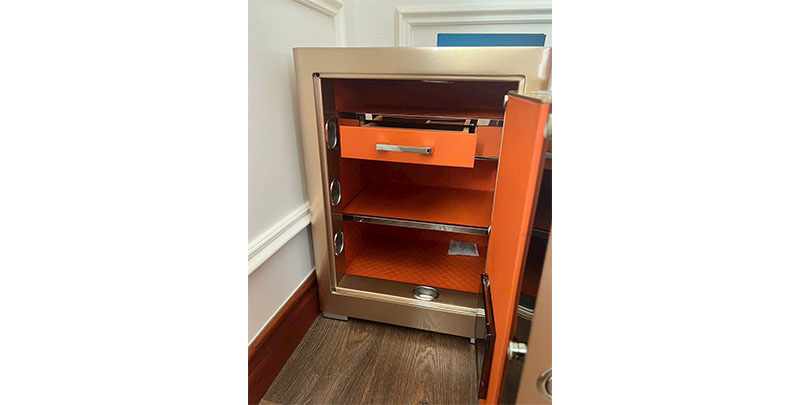 Nội thất két được bọc da cao cấp, chia nhiều ngăn rộng rãi cùng ngăn chuyên biệt dành cho trang sức, đồng hồ hoặc giấy tờ quan trọng. Đèn LED tự động, hỗ trợ quan sát dễ dàng trong điều kiện thiếu sáng.