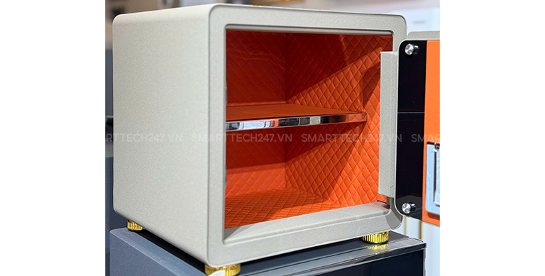 – Cửa két có hệ thống chốt đặc, to, dày – tự động khóa khi đóng kết hợp bản lề ẩn hoặc bản lề chống cạy (tùy phiên bản), giúp tăng khả năng chống trộm.