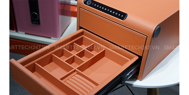 Bảo mật bằng sự ngụy trang: Khi nhìn vào, ít ai có thể nhận ra đây là một chiếc két sắt kiên cố. Nó trông giống như một chiếc hộp đựng trang sức hay một món đồ decor cao cấp, giúp tăng tính bí mật cho tài sản bên trong.