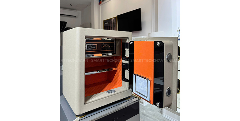 Lòng két được bọc da cao cấp, thường là tông màu cam hoặc da thủ công, giúp tạo nên vẻ sang trọng và bảo vệ tài sản khỏi trầy xước. Nội thất được bố trí ngăn khoa học xuất hiện ngăn kéo phụ kích thước chuẩn (160 × 250 × 230 mm) và kệ chia, giúp phân loại tài sản như giấy tờ A4, USB, trang sức dễ dàng.